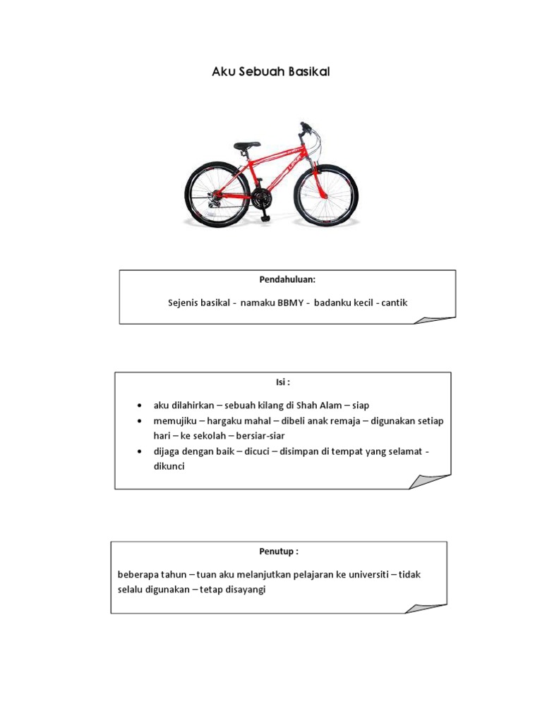 Up to 3 cash back Karangan. Aku ialah sebuah basikal. Aku ialah sebuah basikal Nama aku BMX Aku diperbuat daripada besi.