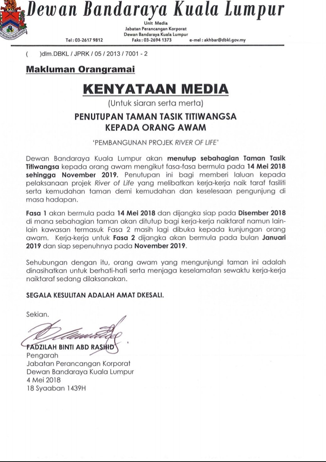 Bfm News On Twitter Dbkl Will Close Portions Of Titiwangsa Park In Phases For The Riveroflife Project Starting 14 05 18 Works To Be Completed By November 2019 Https T Co Lgdixwmuhd Twitter